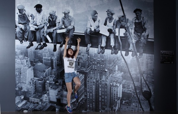 「工安幻視」展覽把經典藝術作品當成工安教材,觀眾還可融入巨型展示中體驗寓教於樂的效果。圖為解說墜落危害與預防措施。(記者黃邦平翻攝)