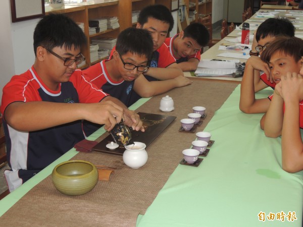北港農工上今特色課程,教導學生體驗品茗。(記者陳燦坤攝)