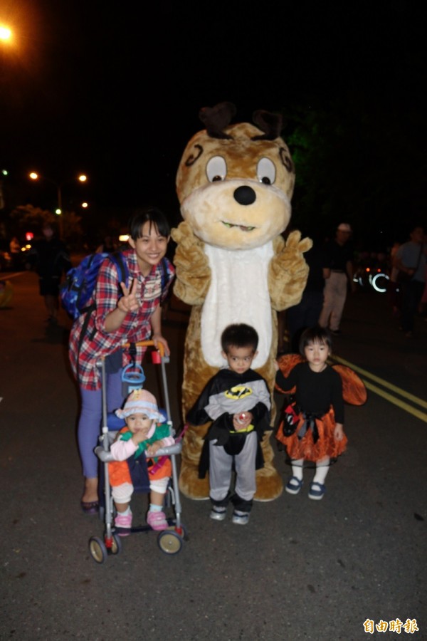 今晚鹿港小鎮有夠HIGH,阿公、阿嬤與爸爸、媽媽都陪著小朋友一起來遊行,不只是小朋友變裝,還有親子同步變裝,有打扮成「蝙蝠俠」爸爸就牽著「小小蝙蝠俠」歡喜遊行,有民眾也帶著狗狗參加遊行,狗狗化身為「小小兵」,也來體驗萬聖節。