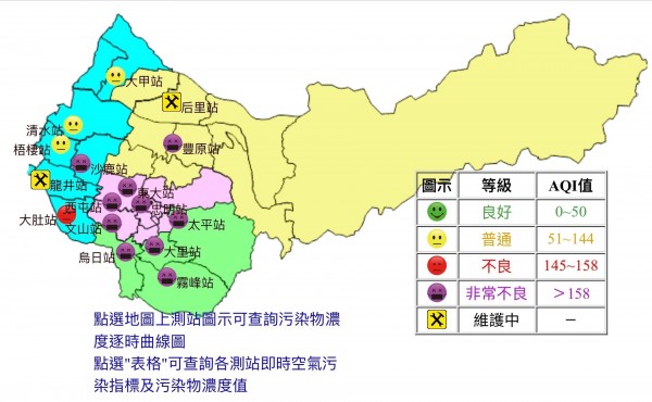 台中市空氣品氣監測站今天幾乎都紫爆了,達到非常不良等級。(記者蔡淑媛翻攝)