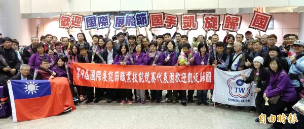 參加國際展能節技能競賽的我國選手,晚間載譽歸國,勞動部特別安排熱舞閃退歡迎。(記者姚介修攝)