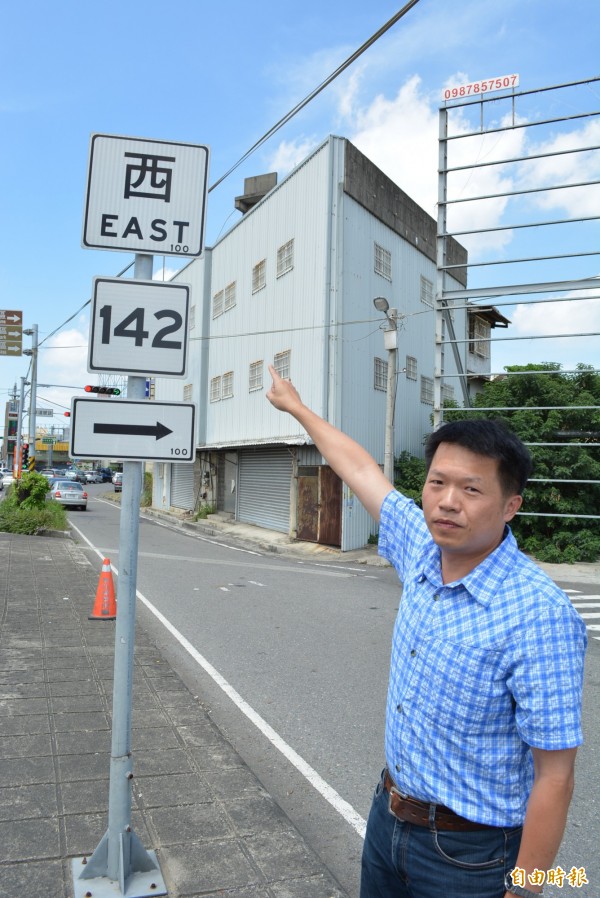 公路總局彰化工務段副段長詹昀燃今天前往勘查這塊烏龍路牌後將盡快改善。(記者湯世名攝)