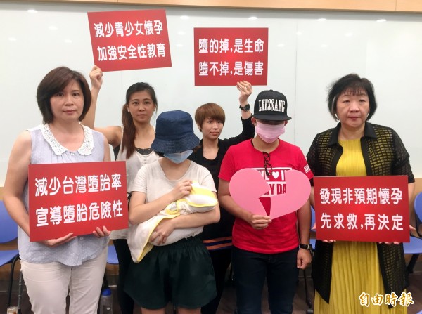 小婷、小芬(左二、右二)現身說法,呼籲非預期懷孕者勿輕易決定墮胎。(記者張菁雅攝)