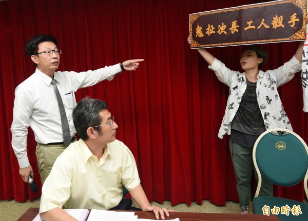 「工鬥」成員質疑連「7休1」的例假都要棄守,還有什麼好談?他們拉起「次長鬼扯、工人殺手」橫幅,引起一陣推擠、場面混亂。(記者廖振輝攝)
