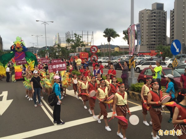 新竹縣國際花鼓藝術節今天下午開幕,35個表演團隊踩街遊行。(記者蔡孟尚攝)