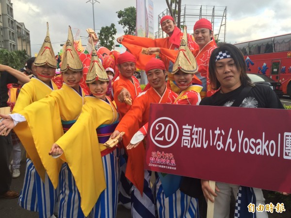 新竹縣國際花鼓藝術節邀請不少國外表演團隊參加,日本高知yasakoi舞蹈團在踩街隊伍中相當受到矚目。(記者蔡孟尚攝)