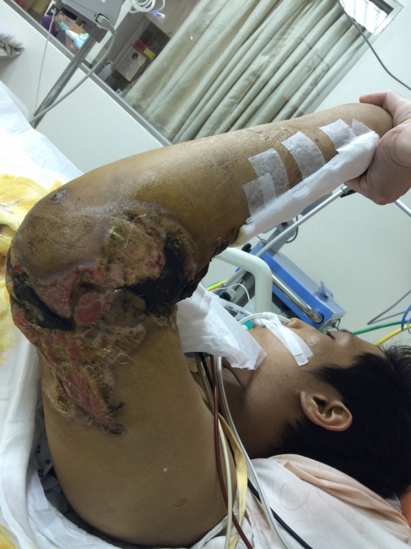 傅尹志表示,病患隨後又陸陸續續開了4次大手術,才總算接回左臂,並切除約30%的肝臟和10多公分小腸,總輸血達到1萬2000c.c.,等於全身的血換了2次半。