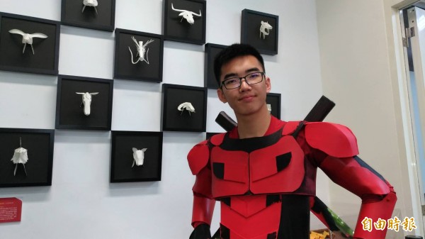 17歲的天才剪紙少年謝寧,身著他「剪」出來的「死侍」服裝,牆上掛的則是他的12生肖剪紙作品。(記者廖淑玲攝)
