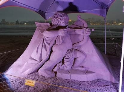 沙雕藝術品與婚禮廣場相互呼應,以婚「沙」為主題,展出愛神邱比特、新娘造型的沙雕。(高灘處提供)