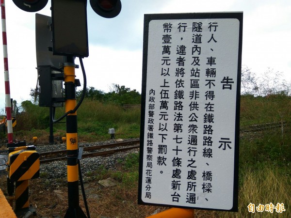 為避免民眾誤闖鐵軌,鐵路警察局已經在櫻木平交道旁設置告示牌。(記者王秀亭攝)