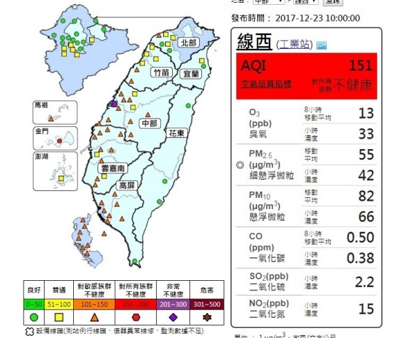 根據環保署空氣品質監測網資料,AQI出現「不良紅」的測站包括彰化線西測站及金門測站,指標污染物為細懸浮微粒(PM2.5)。而其他AQI在警戒橘的測站,指標污染物亦為PM2.5。