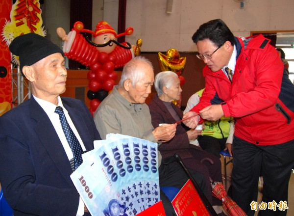 彰化市長邱建富(右)為長者獻上春節敬老禮金。(記者湯世名攝)
