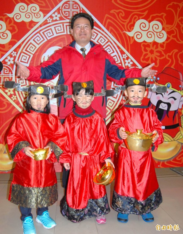 彰化市長邱建富和三位「小財神」相見歡。(記者湯世名攝)