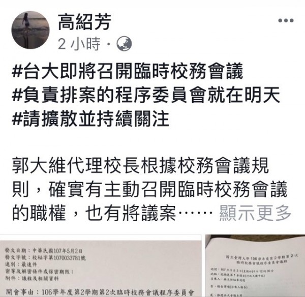 台大行政擬告教育部,明先開程序委員會「挺管」,前校務會議學生代表高紹芳今晚在臉書直批形同黑箱會議。(記者林曉雲翻攝)