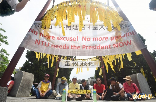 台大行政會議決定和教育部打行政官司,且預計在5月12日召開校務會議取得授權;代理校長郭大維明天召開程序委員會,排定臨時校務會議的日程。圖為一些不滿教育部處置的抗議人士在台大傅鐘繫黃絲帶、靜坐。(資料照,記者廖振輝攝)