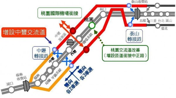 桃園市政府交通局說明國道1號桃園交流道動線改善工程和增設中壢中豐交流道計畫圖。(記者李容萍翻攝)