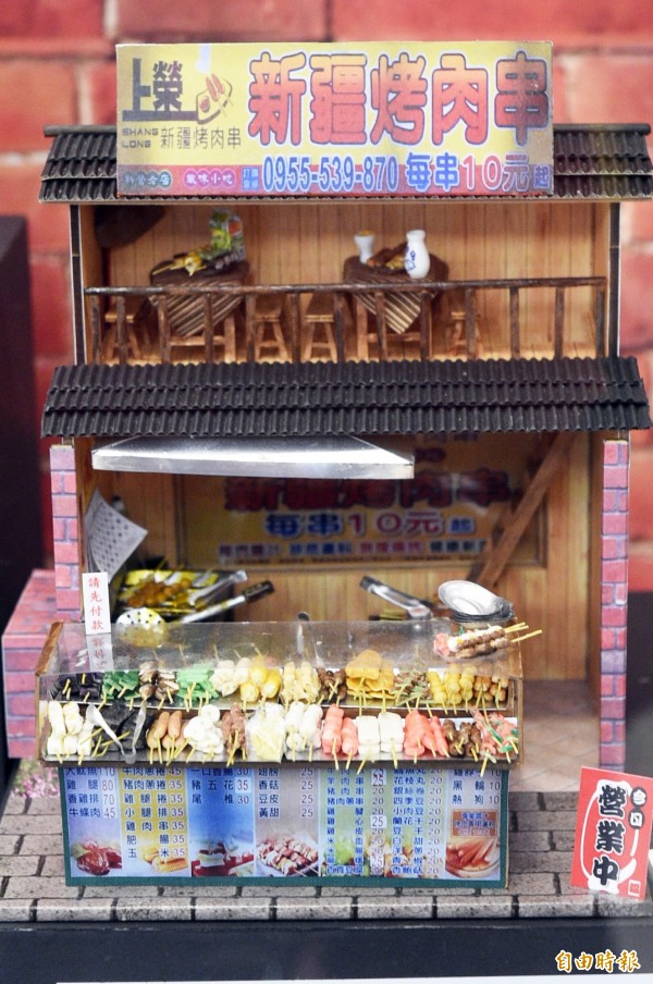 新疆烤肉串店的模型食品,讓人看了食指大動。(記者張忠義攝)