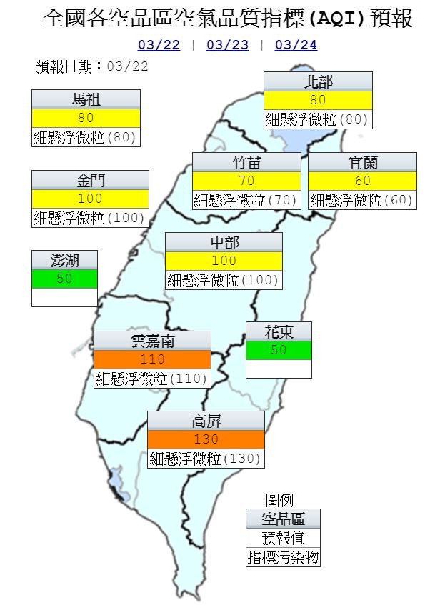 雲嘉南、高屏空品區為「橘色提醒」;北部、竹苗、中部、宜蘭空品區及馬祖、金門地區為「普通」等級;花東空品區及澎湖地區為「良好」等級。(圖擷取自行政院環保署)
