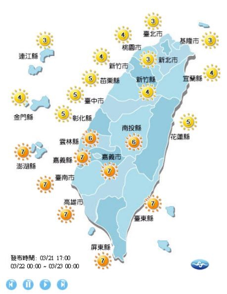 紫外線方面,各地紫外線多落在「中量級」,而雲嘉南、高屏、台東、南投及澎湖地區達「高量級」,請當地民眾注意,並盡量待在陰涼處。