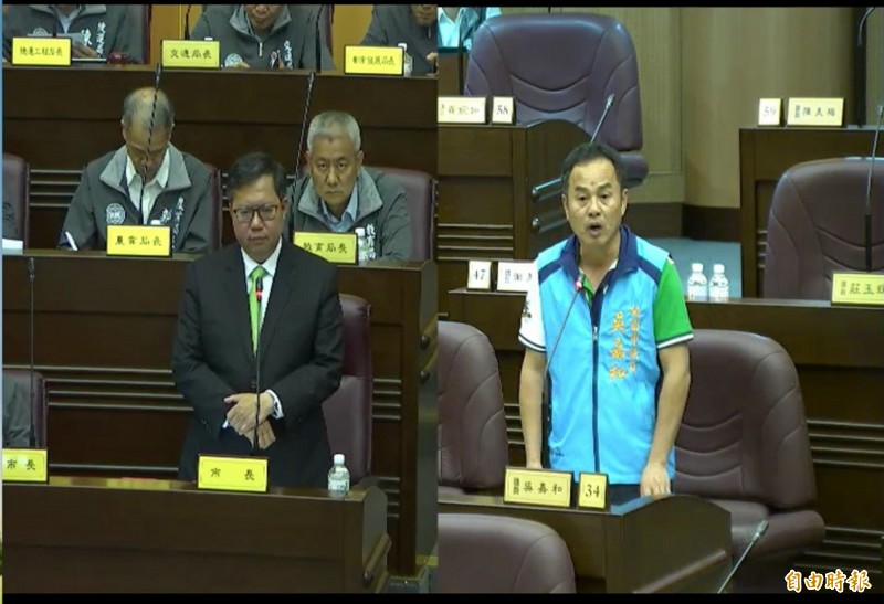 桃園市議員吳嘉和質詢時,要求提高囤積工業地稅費。(記者謝武雄攝)