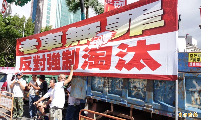 第5期排放標準的大型車輛進口、生產、販售年限延長,讓業者有更多緩衝時間。圖為老車自救會曾為生存權集結上街抗議。(資料照,記者方賓照攝)