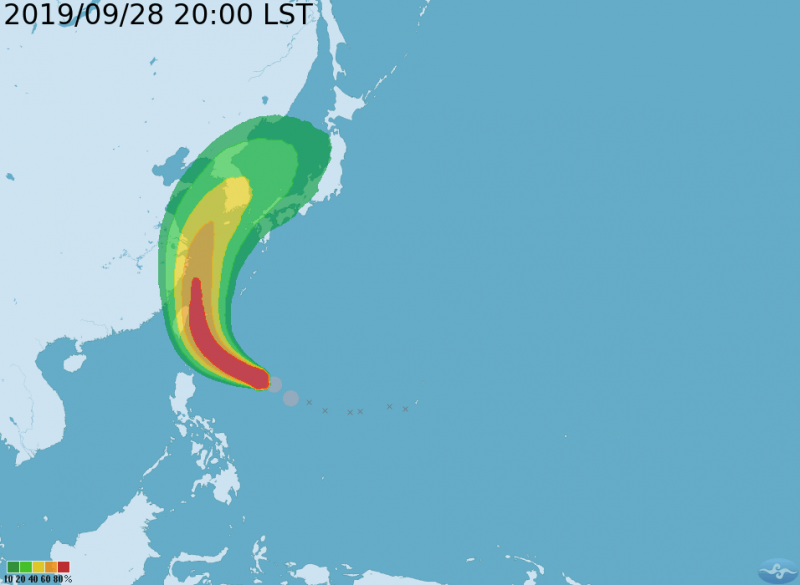 從中央氣象局28日晚間8時發布的最新颱風七級風暴風圈「未來120小時的侵襲機率圖」中,也可見相較先前更偏西了不少。