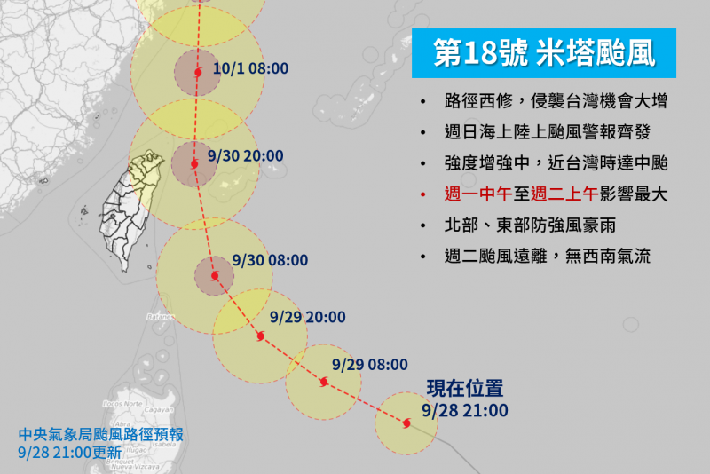 第18號輕度颱風米塔飆速靠近台灣,預計週一將是距台最近的時間,晚間氣象局大幅修正路徑,預報資料不斷向西調整。(擷取自「天氣風險 WeatherRisk」粉專)