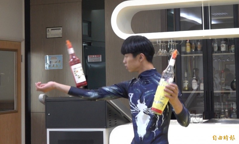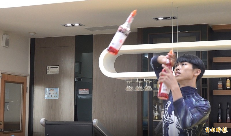 建國科大學生莊家豪,為了練習花式調酒,摔破了成千上萬個瓶子。(記者劉曉欣攝)