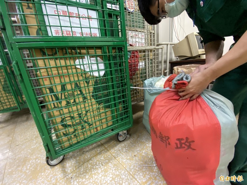 5千多包口罩運抵高雄市區,郵局人員慎重分裝。(記者黃旭磊攝)
