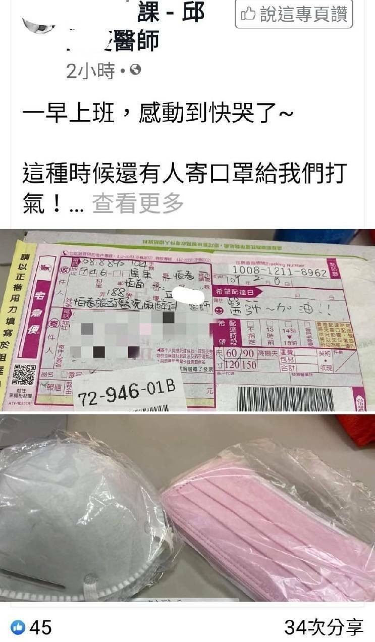 從邱姓醫師臉書粉專所po出的照片判斷,該不具名的熱心人士,在宅配箱上註記「醫師~加油!!」字眼,邱姓醫師說,在這種時候還有人寄口罩給他們打氣,實在是感動到要哭了。