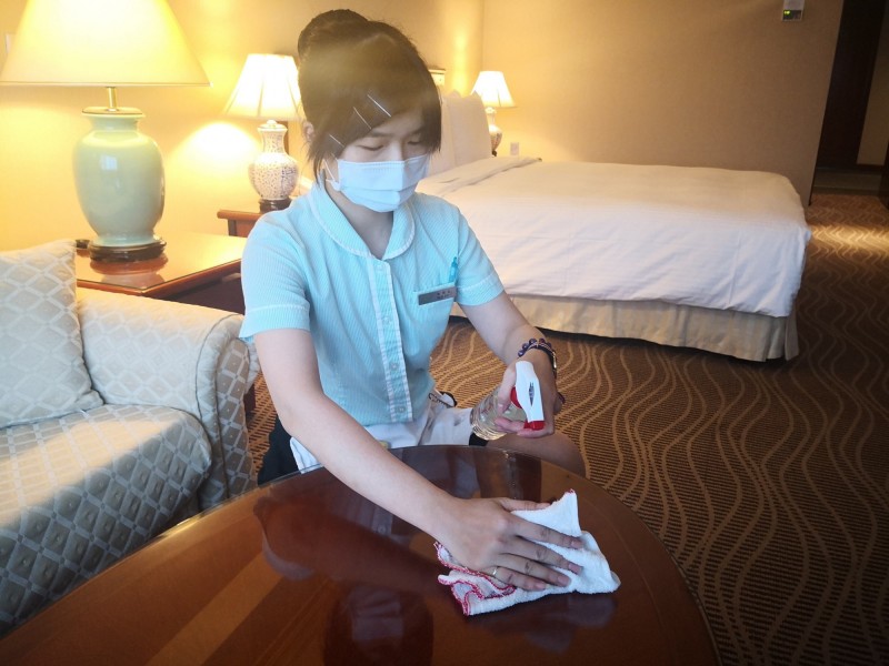 台中長榮桂冠酒店加強客房消毒。(台中長榮桂冠酒店提供)