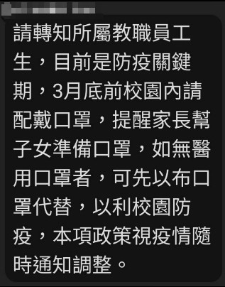 新北市教育局透過訊息通知公私立高中以下各級學校,即日起「鼓勵」教職員工及學生入校上課全面配戴口罩。(記者周湘芸翻攝)