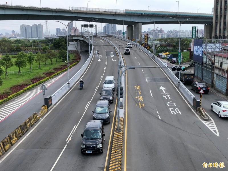 新北市成蘆橋為連接蘆洲及五股區的交通要道,五股端下橋處仍未設置機車專用道。(記者周湘芸攝)
