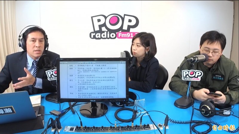 台北市觀光傳播局長劉奕霆(右起)、台北市政府副發言人黃瀞瑩,接受「POP Radio」廣播節目主持人黃暐瀚專訪。(記者蔡亞樺攝)