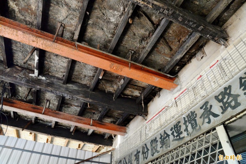 工程人員表示,騎樓天花板也是過去木造結構,雖有鋼條支撐,但已損毀不堪。(記者許麗娟攝)