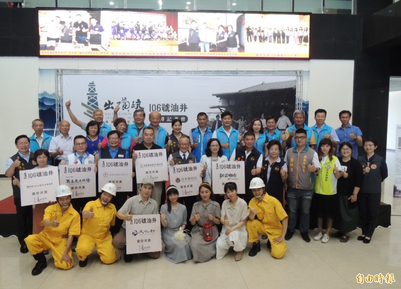 EX-亞洲劇團於台灣油礦陳列館前廣場演出《106號油井》戲劇,苗縣府舉辦記者會行銷,邀請民眾踴躍前往觀賞。(記者張勳騰攝)