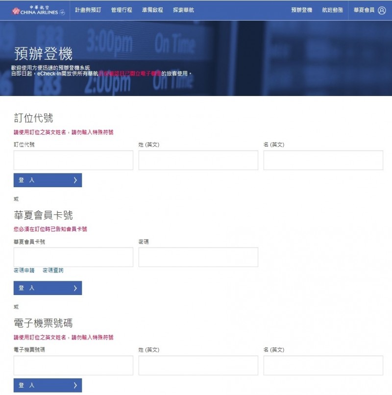 中華航空表示,搭乘華航旅客於表訂航程前48小時至航班起飛前80分鐘,可在家裡、辦公室或旅館,使用智慧型手機或平板電腦輕鬆辦理預辦登機手續,並能同時安排喜歡的座位;使用華航預辦登機功能,只需備妥訂位代號或機票號碼、護照、簽證等旅行證件,完成相關資訊,5分鐘即可輕鬆自行列印登機證,或使用手機電子登機證功能,節能減碳又便利。