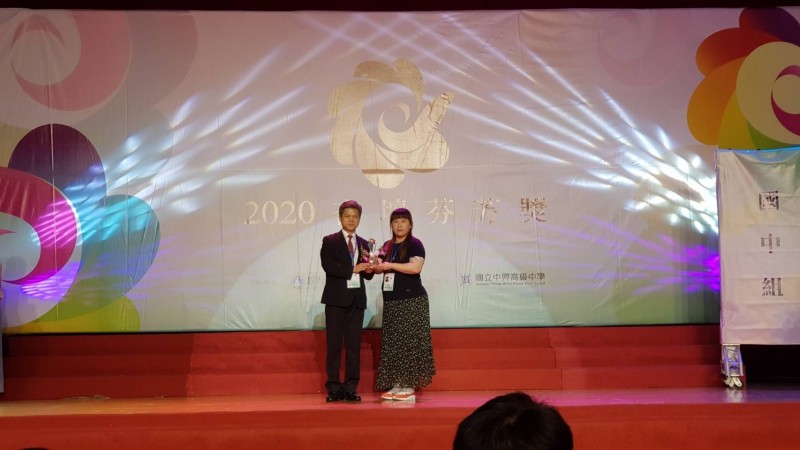 109年杏壇芬芳獎今天於南投市中興新村舉行頒獎典禮,服務近20年的基隆市建德國中老師林月華(右)今天出席領取「杏壇芬芳獎」。(記者俞肇福翻攝)