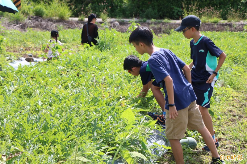 小朋友在田中找尋成熟的西瓜。(記者萬于甄攝)