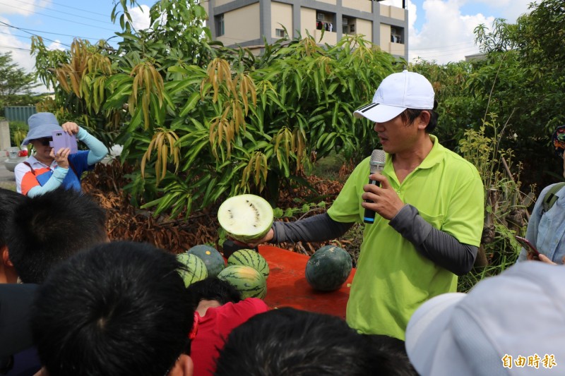 青農蘇宇洋種植的白肉西瓜讓小朋友驚呼連連。(記者萬于甄攝)