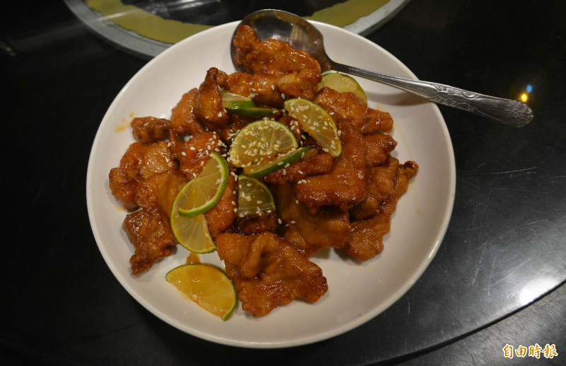 彭城堂的寶島四季果香排骨,加入自家種的柚子、檸檬、鳳梨、百香果和水蜜桃合成的5種果汁,口味獨特。(記者陳建志攝)