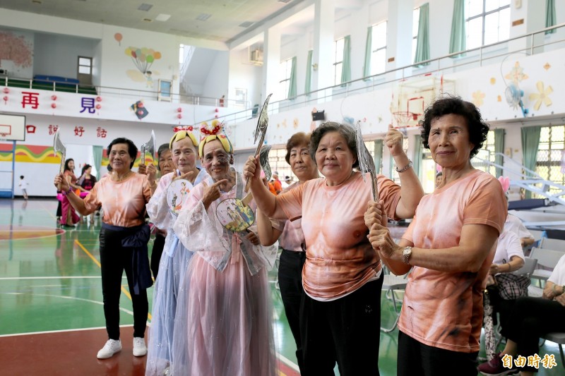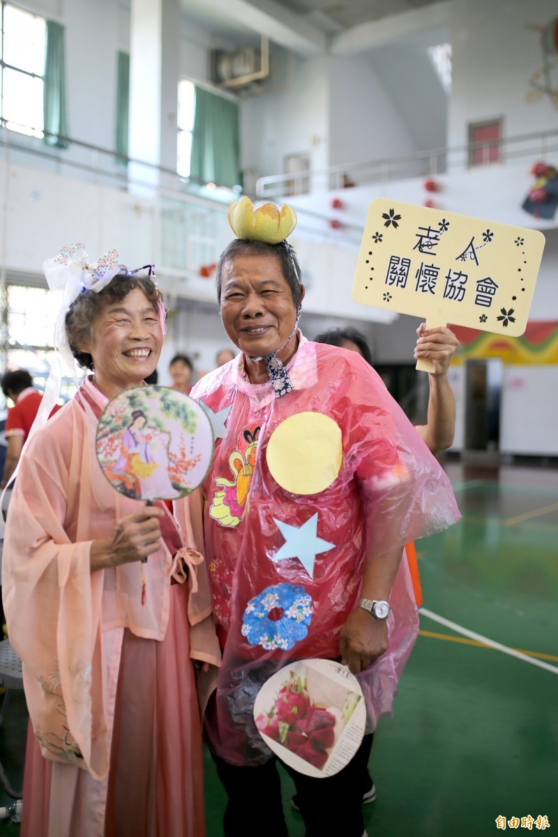 阿嬤們穿上肌肉T恤化身吳剛,阿公們則男扮女裝,以柚子皮做髪飾變身嫦娥,演繹中秋傳說故事。(記者邱芷柔攝)