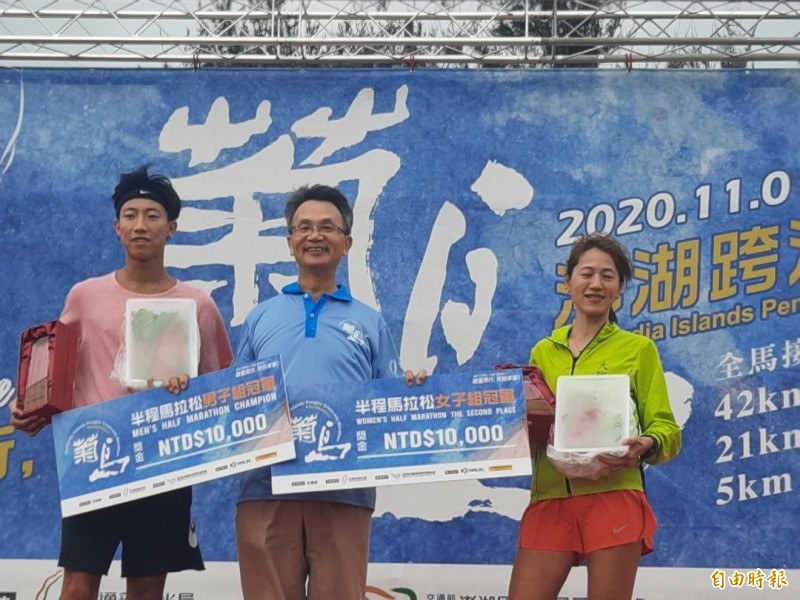全馬組42公里男女組冠軍,分別為王源鋐、濱崎純子。(記者劉禹慶攝)