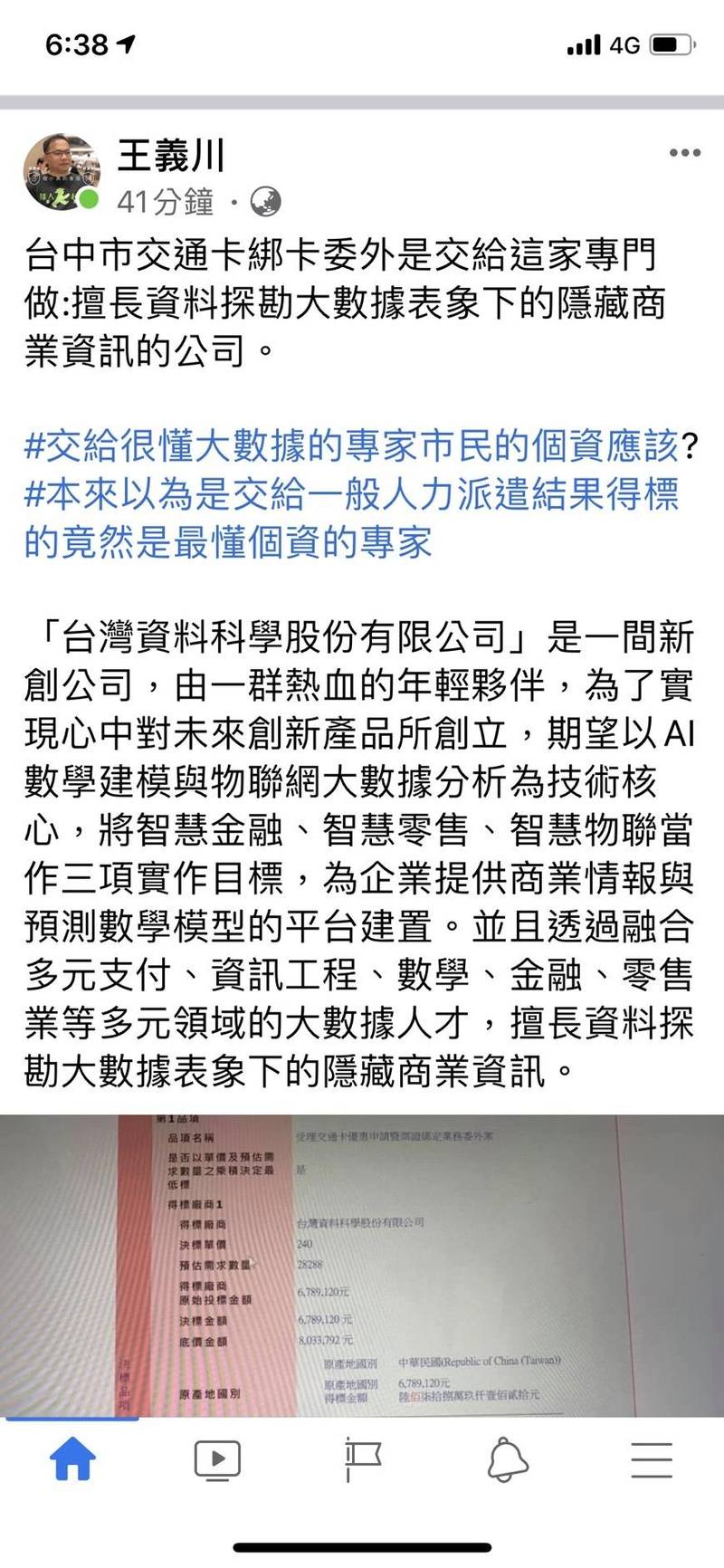 中市前交通局長王義川在臉書貼文,質疑市府委外綁卡要交給最懂個資的專家。(翻攝王義川臉書)