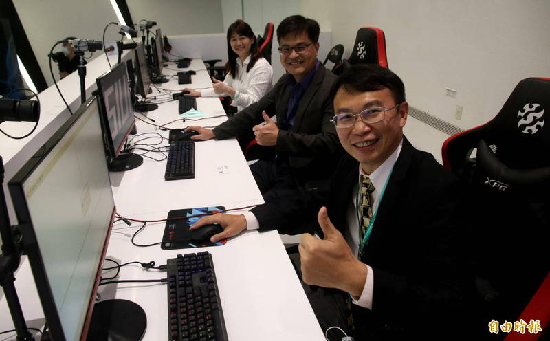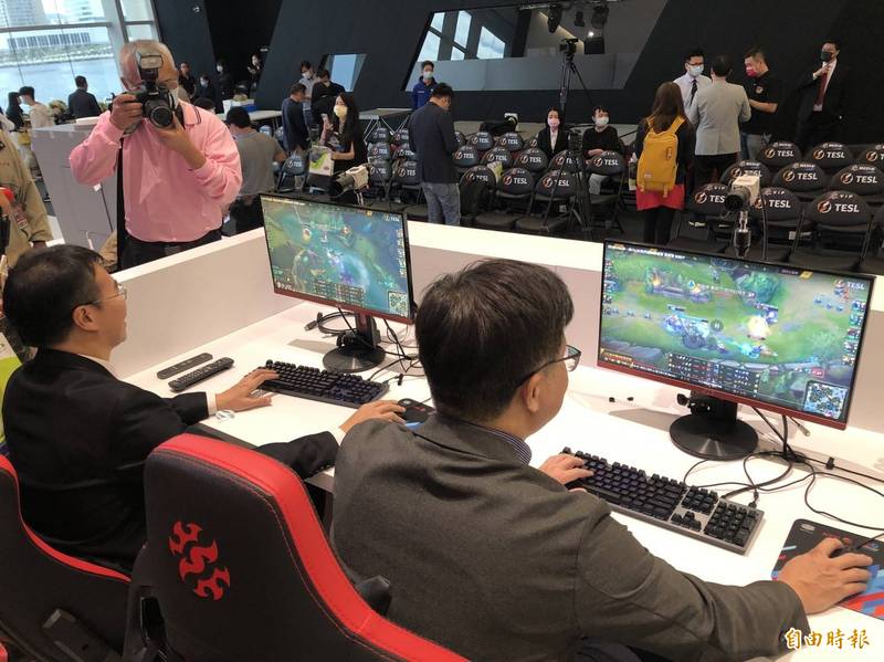 高雄市毒品防制局長林瑩蓉(左起)、教育局長謝文斌及運發局長侯尊堯先於電競館PK。(記者黃旭磊攝)