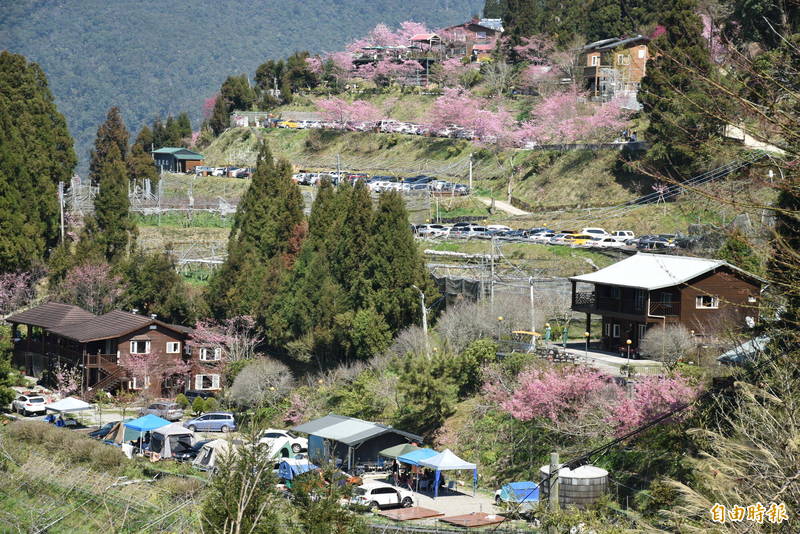 桃園市拉拉山櫻花滿開,賞櫻人潮湧入。(記者李容萍攝)