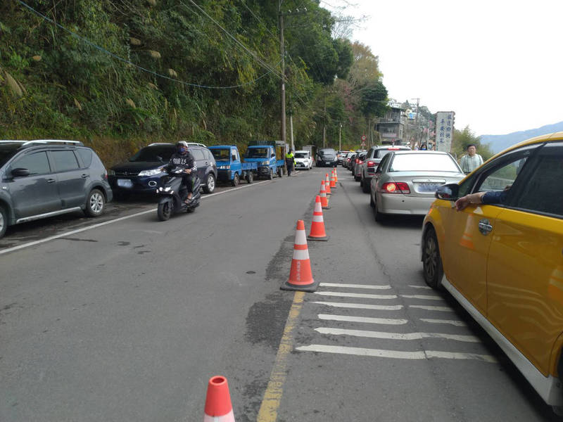 桃園市拉拉山櫻花滿開,賞櫻車潮湧入。(記者李容萍攝)