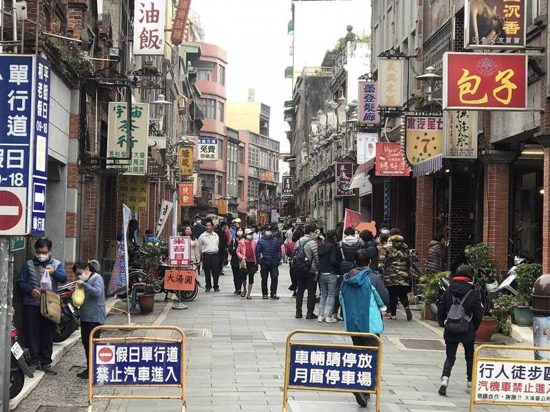 228連假又是好天氣,桃園市大溪老街下午的人潮燈號亮黃燈。(記者李容萍攝)