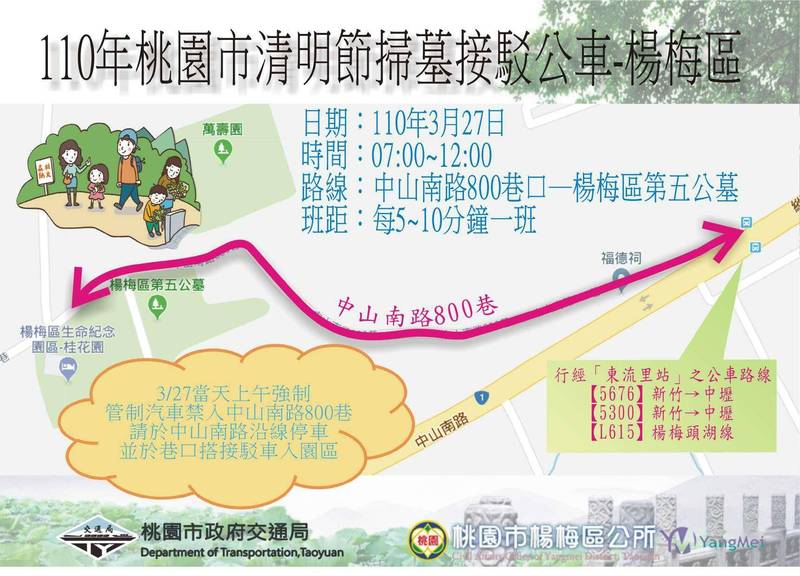 楊梅線則是「中山南路800巷口-楊梅生命紀念園區」開車時間為3月27日早上7點到中午12點,每15到20分鐘一班車。