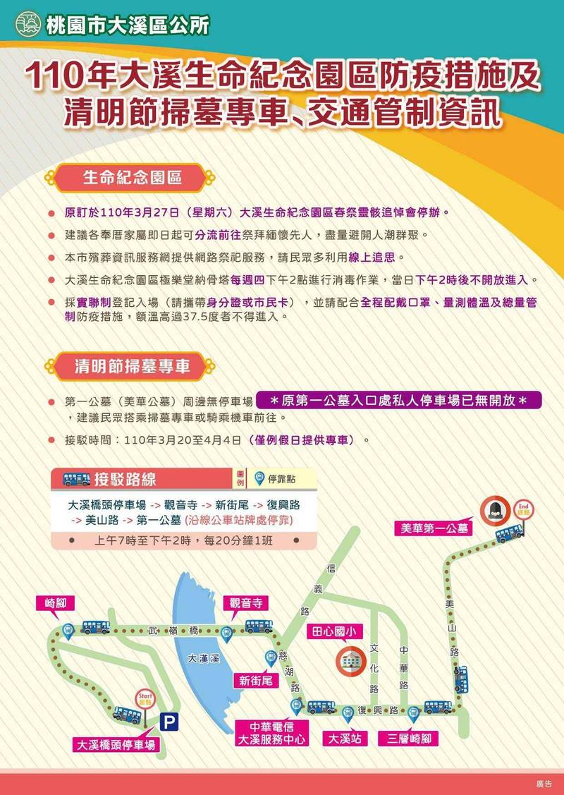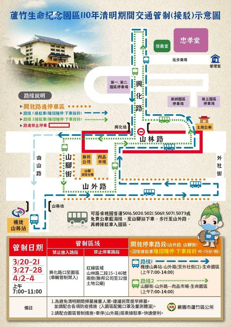劉慶豐說,除4蘆竹區、楊梅區採隨招隨停方式,大溪區採既有站牌停靠方式服務掃墓民眾,警察單位也會在沿路進行各項管制措施,而因應清明掃墓可能帶來人潮,各公墓、納骨塔或生命紀念園區將採取人潮分流及疏散對策,也停辦聯合法會。